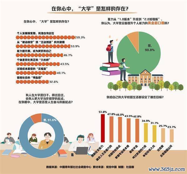 上周,中国后生报社社会探听中心汇集问卷网(wenjuan.com),对1500名大一重生进行的一项探听浮现,59.3%的受访大一重贸易志到大学是个东说念主发展探索期,需找准本人定位。90.8%的受访大一重生明确,大学是全面提高个东说念主才智的黄金窗口期。在受访大一重生设定的大学筹备中,提高外交才智(51.0%)、笃定东说念主生发展看法(47.0%)、克服脾气缺陷(46.0%)位列前三。
