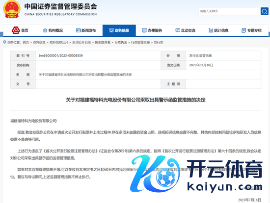 2023年7月,证监会对福特科选拔出具警示函的监管措施。证监会发现,福特科在肯求初度公蛊惑行股票并上市进程中,存在多项未败露的资金占用、违法担保信息败露不完竣、其他里面摈弃问题较多和研发东谈主员信息败露不准确等问题。