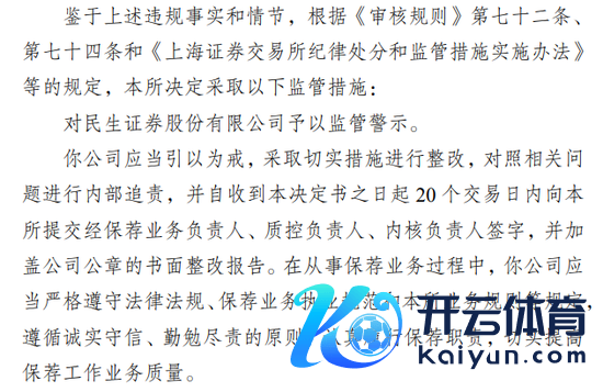上交所称,民生证券应当引觉得戒,选拔切实措施进行整改,对照干系问题进行里面追责,并自收到决定书之日起20个交游日内提交经保荐业务负责东谈主、质控负责东谈主、内核负责东谈主署名,并加盖公司公章的书面整改讲解。