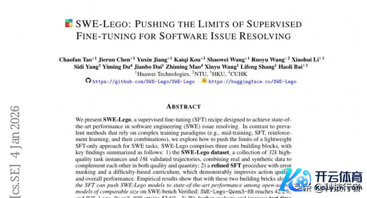 这项由华为时代有限公司、南洋理工大学、香港大学和香港汉文大学连系完成的冲突性经营发表于2026年1月,论文编号为arXiv:2601.01426v1。经营团队通过一种名为SWE-Lego的立异老练方法,让相对较小的8B参数模子在软件代码自动征战任务上的进展超越了很多32B以致70B的大型模子。这就像是让一位武艺深湛的专科大夫在复杂手术中驯服了警告更丰富的全科大夫一样令东谈主骇怪。