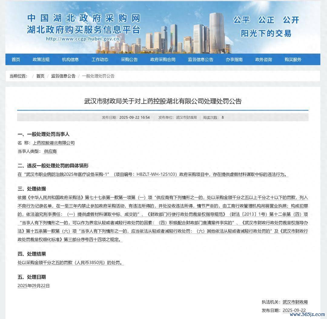 近日,武汉市财政局发布对于对上药控股湖北有限公司处分处罚公告。
