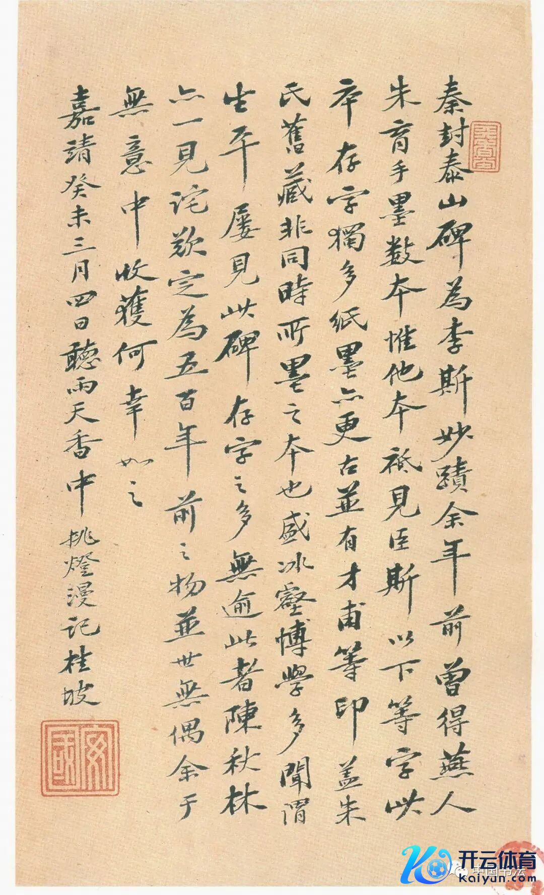 【10】{安国跋} 《秦封泰山碑》为李斯妙迹。余年前曾得燕东说念主朱育手墨数本,惟他本只见臣斯以下第字,此本存字独多,纸墨亦更古,并有才甫等印。盖朱氏旧藏,非同期所墨之本也。盛冰壑博学多闻,谓生平屡见此碑,存字之多,无逾此者。陈秋林亦一见诧欢,定为五百年前之物,并世无偶。余于意外中收成,何幸如之。嘉靖癸未三月四日,听雨天香中挑灯漫记,桂坡。