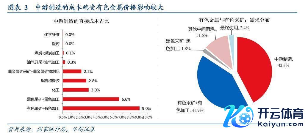 2025年10月以来,有色金属涨幅较大。以PPI有色矿产、PPI有色加工两大行业来看,举座的价钱高潮幅度为18.6%(2025年10月-2026年2月),同时,中游制造业的PPI累计高潮幅度为0.9%。从中游制造业的本钱端来看,有色采矿与有色加工共计的本钱占一谈本钱之比为9%,因而有色金属的大幅高潮对其本钱带来较大冲击。
