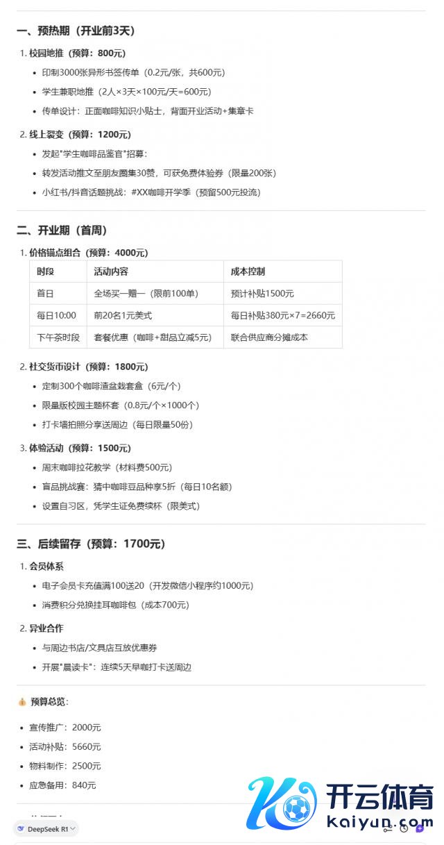 发问:我是一家新开的咖啡馆店主,需要一份开业促销有筹划。预算 1 万元内,主要面向大学生群体。咱们店铺位于大学城,主打极品咖啡。