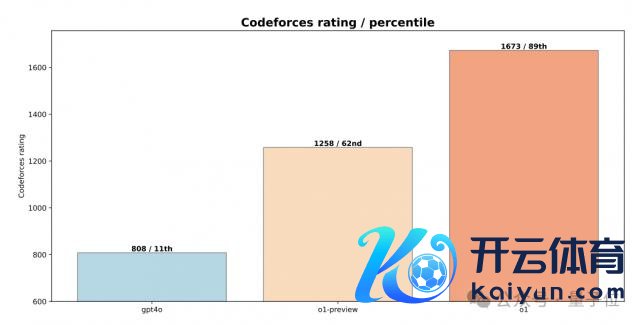 在 CodeForce 基准测试中,o1 拿下了 1673 分(89th percentile)。