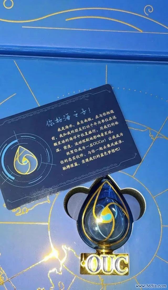 中国海洋大学的收用奉告书礼盒终点抽象,其中不仅有收用奉告书,还有茶包等物品,最激勉爱护的是,礼盒中还有一枚缀有中国海洋大学英文缩写的水点形吊坠,吊坠为水点形内部含有来自南极的海水,吊坠下方聚合着中国海洋大学的英文缩写" OUC "。