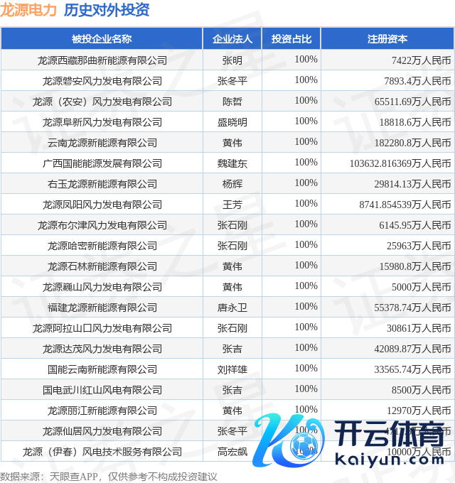 本站音问,把柄天眼查APP裸露,龙源电力(001289.SZ)新增一皆对外投资事件,被投资公司为民勤国能风力发电有限牵扯公司,法定代表东谈主刘开国,投资占比为51%。该公司从事电力、热力坐褥和供应业,注册成本为16600万东谈主民币。现在,龙源电力共存在对外投资274项,投资占比前20的状貌见下表: