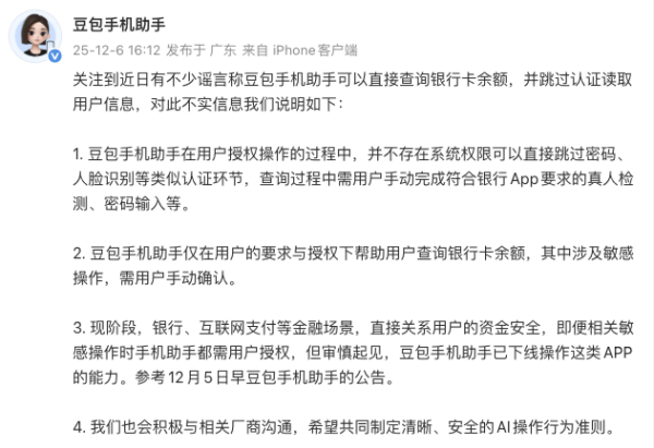 12月6日开云体育,@豆包手机助手发布声明称,网传“豆包手机助手不错平直查询银行卡余额,并跳过认证读取用户信息”为坏话。豆包手机助腕默示,其仅在用户的条目与授权下匡助用户查询银行卡余额,其中波及明锐操作,需用户手动阐明。此外,豆包手机助手在用户授权操作的进程中,并不存在系统权限不错平直跳过密码、东说念主脸识别等近似认证挨次,查询进程中仍需用户手动完成相宜银行App条目的真东说念主检测、密码输入等。......【更多...】